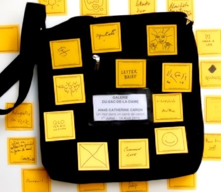 Cent carrés de papier jaune et encre noir sur divers supports, exposés dans le cadre de l'exposition "Un mot dans un carré de caron", Galerie-du Sac-de-la-Dame, Paris, Turin, Locarno, 2013.